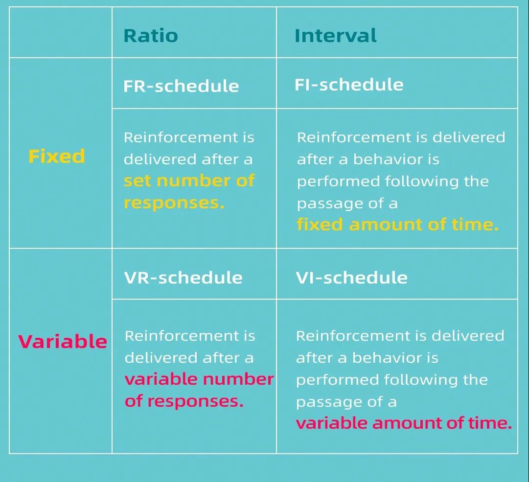 我们可以基于行为出现的次数(ratio),也可以基于时间周期(interval)给予强化物;我们可以在行为出现固定的次数、固定的时间流逝后(fixed)给予强化物,也可以随机(variable)地给予。