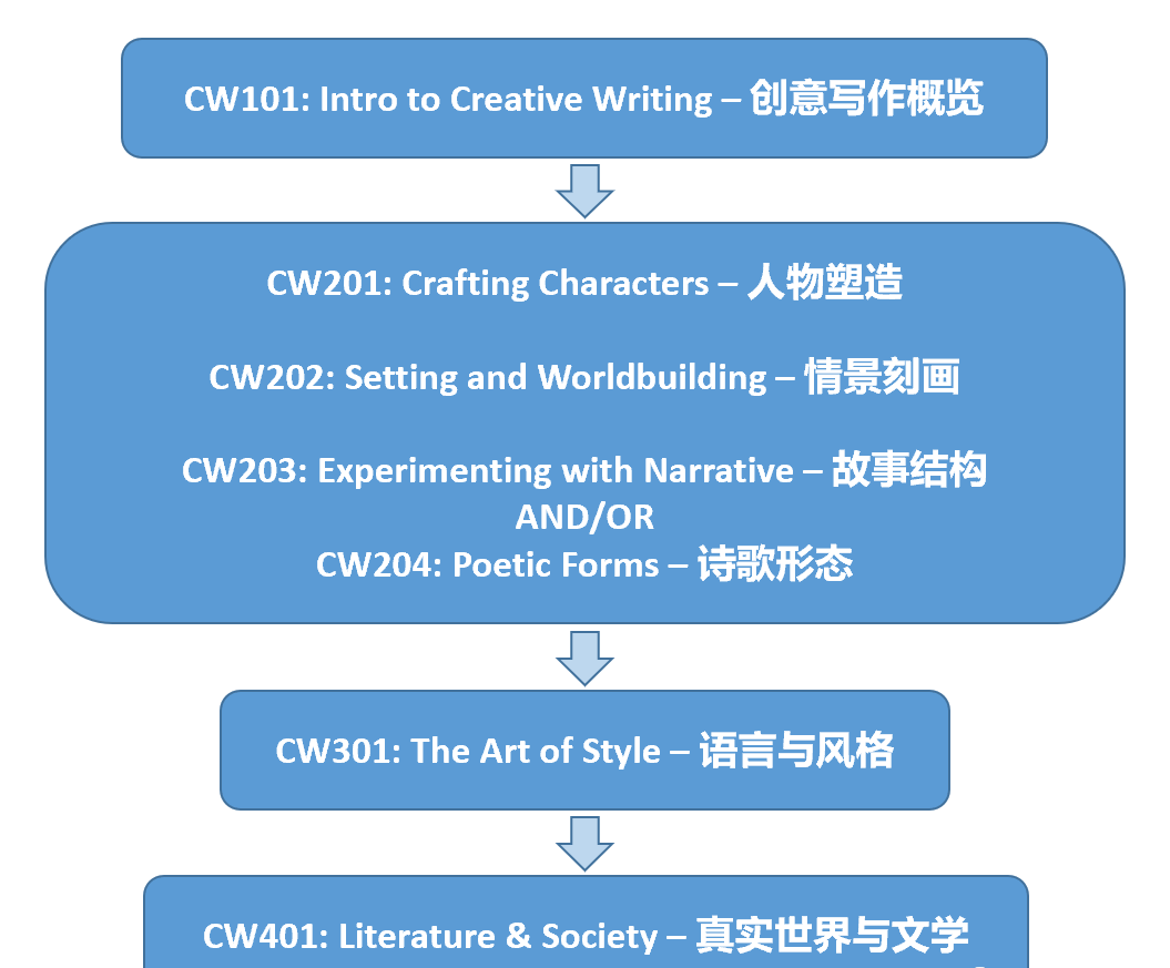 每节课前,学生将根据课程要求阅读经典短篇文学或长篇文学选段。讨论课上,老师将带学生一起探讨写作过程中将会碰到的技术难题并通过对名家作品的分析学习这些难题的解决方法。课后,学生将通过布置的写作任务练习所学写作技巧,并得到详细反馈。