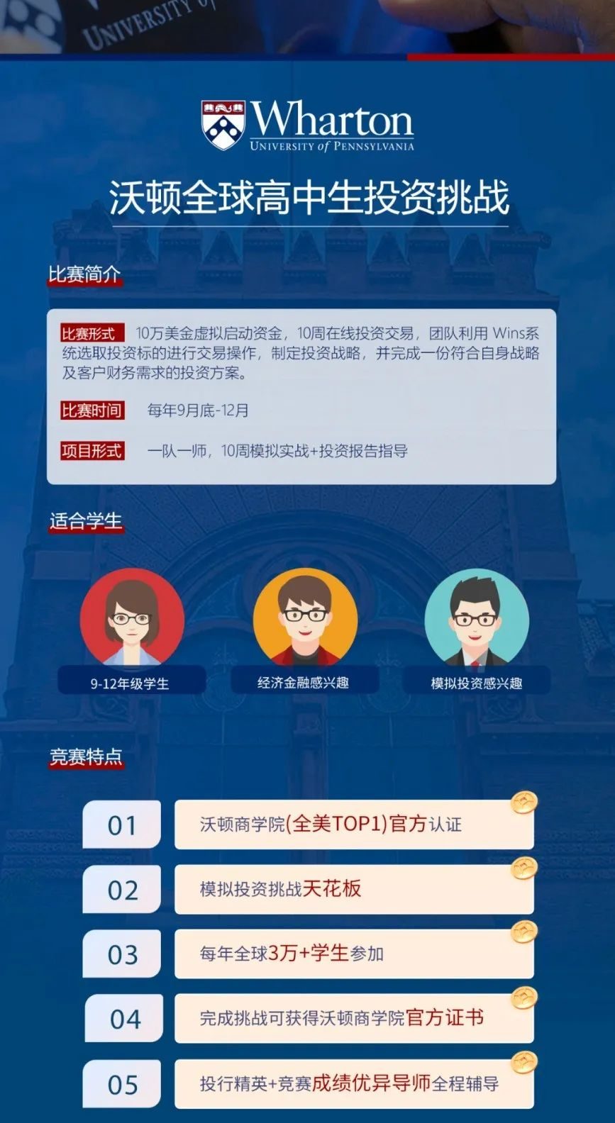 WGHS沃顿商赛是一项面向全球9-12年级高中生和教师的免费线上投资竞赛。此赛事由美国宾夕法尼亚大学沃顿商学院(U.S.News本科商学院NO.1)官方举办,极富声望,对于那些对商科充满兴趣的学生来说无疑是首选。